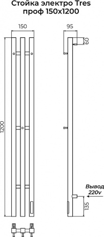 Полотенцесушитель электрический 1200*150 Terminus "TRES" проф, КС RAL графит